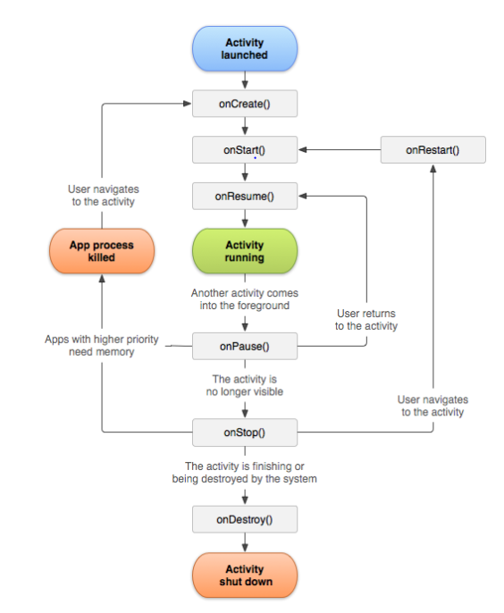 | 실행(Running) | 화면상에 액티비티가 보이면서 실행되어 있는 상태. 액티비티 스택의 최상위에 있으며 포커스를 가지고 있음 |