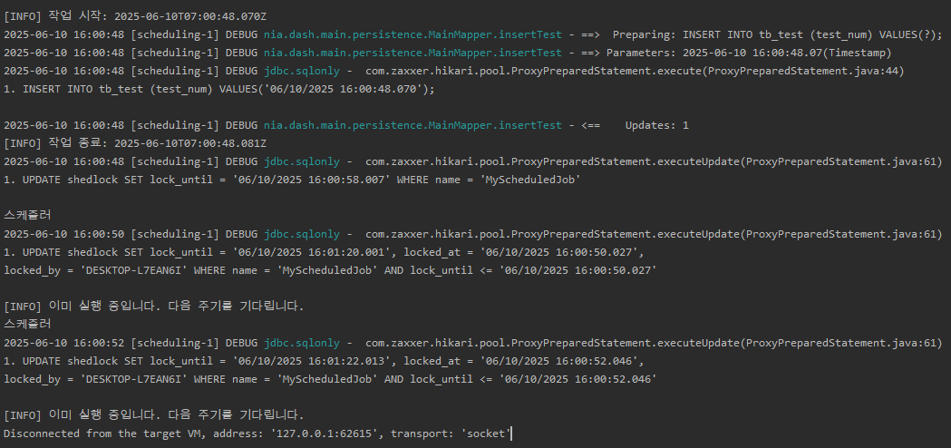 여기까지 하면 ShedLock 스케줄러를 사용할 수 있다.